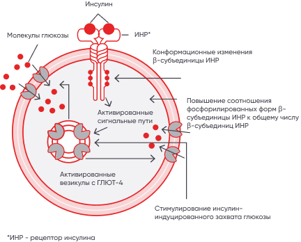 - Субетта® через β-субъединицу рецептора инсулина изменяет его пространственную структуру, что позволяет активировать ГЛЮТ-4 и способстует прохождению глюкозы внутрь клетки;